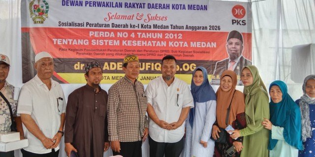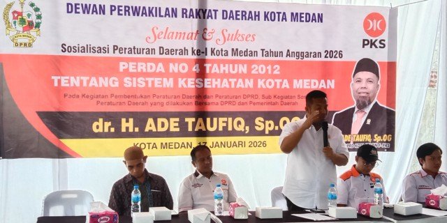 Hal itu disampaikan Ade Taufiq saat Sosialisasi Peraturan Daerah Nomor 4 Tahun 2012 tentang Sistem Kesehatan Kota Medan, yang digelar di dua lokasi, yakni Jalan Sisingamangaraja Gang Thawalib, Kelurahan Kotamatsum III, Kecamatan Medan Kota, serta Jalan Sepakat Gang Kerabat, Kelurahan Binjai, Kecamatan Medan Denai, Sabtu, 17 Januari 2025. Kegiatan tersebut dihadiri ratusan warga.